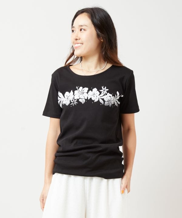 ハイビスカスモチーフのプリントにスタッズを組み合わせたデザインがポイントのTシャツ。やわらかなコットン素材で着心地が良く、普段使いはもちろん、フラのレッスン着としてもおすすめ。華やかさと動きやすさを両立した一枚です。