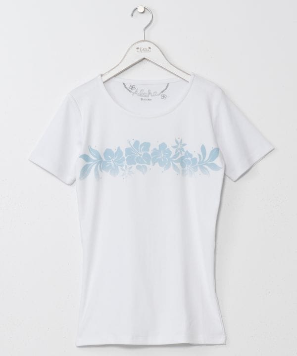 ハイビスカスモチーフのプリントにスタッズを組み合わせたデザインがポイントのTシャツ。やわらかなコットン素材で着心地が良く、普段使いはもちろん、フラのレッスン着としてもおすすめ。華やかさと動きやすさを両立した一枚です。