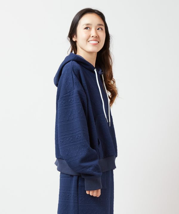 ストレッチ性のあるふくれジャカード素材で仕立てたフード付きトップス。柔らかな着心地でリラックス感があり、スカートとのセットアップコーデもおすすめ。ロングシーズン活躍する万能アイテムです。