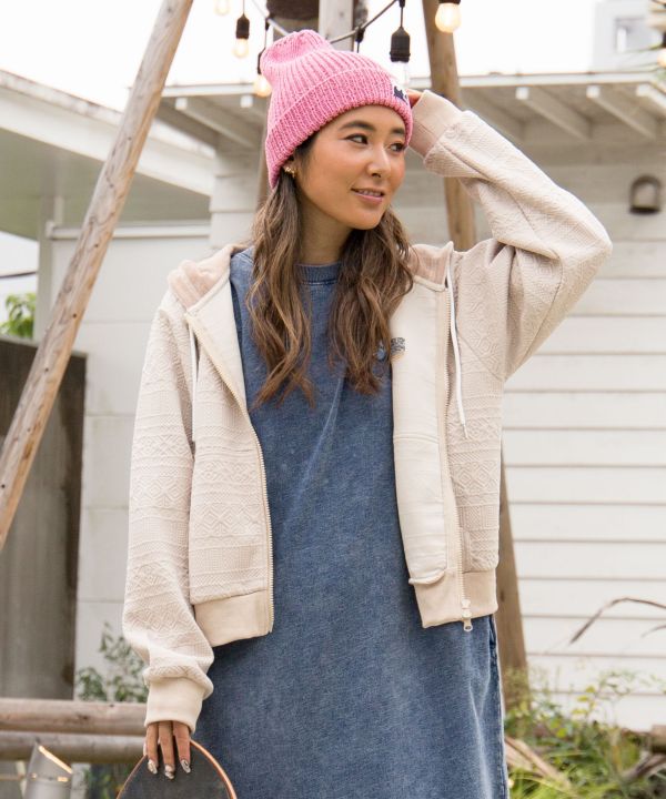 ストレッチ性のあるふくれジャカード素材を使用したジップパーカー。Wジップ仕様でアレンジしやすく、軽やかで快適な着心地。スカートとのセットアップコーデにもおすすめです。