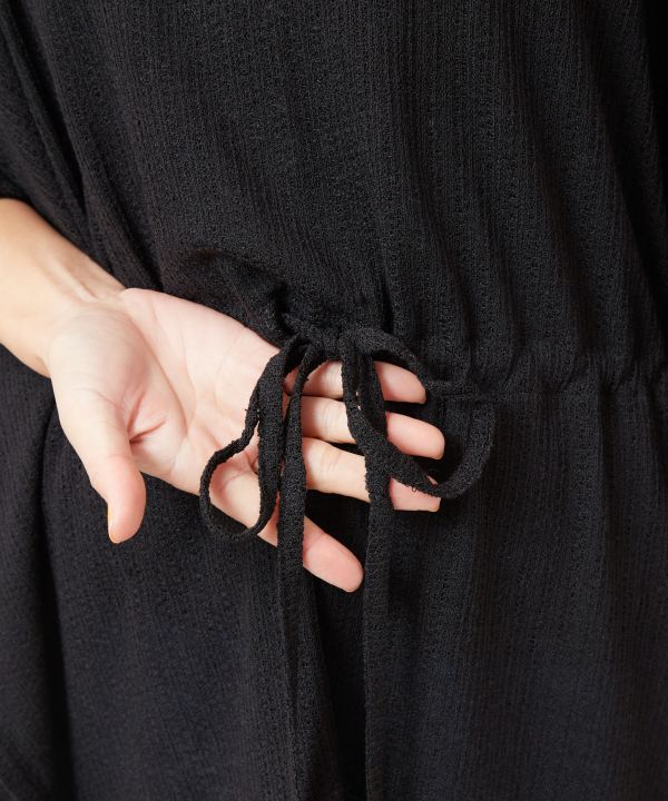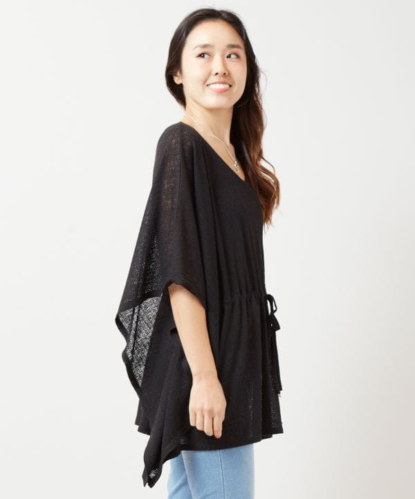 肌触りの良い透け感のあるニットソートップス。ウエストの紐でシルエットを調整でき、幅広い体形にフィットします。軽やかな素材感でリラックス感のある着こなしにぴったり。