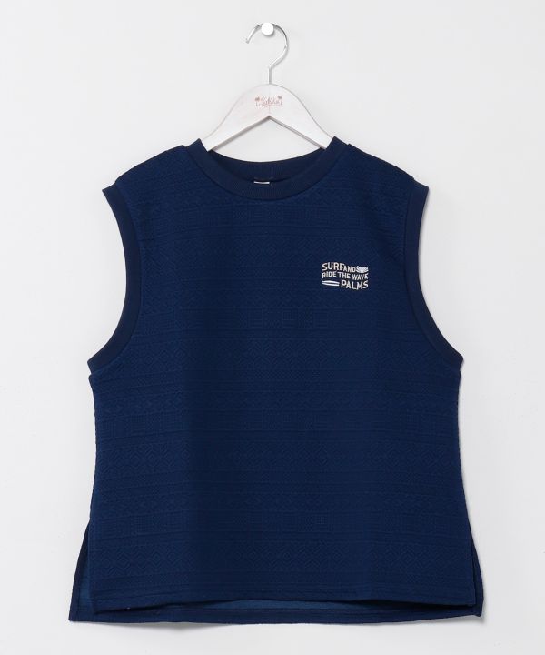 ストレッチ性のあるふくれジャカード素材を使用したノースリーブトップス。タイトすぎないシルエットで動きやすく、肌触りも快適。スカートとのセットアップコーデで統一感のあるスタイルが楽しめます。