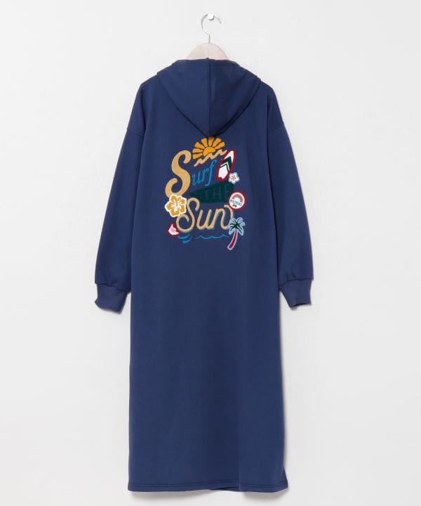 サガラ刺しゅうと機械刺しゅうを組み合わせたポップなデザインが目を惹くフード付きワンピース。やわらかな裏毛素材で着心地が良く、カジュアルながらも遊び心のあるスタイルを楽しめます。