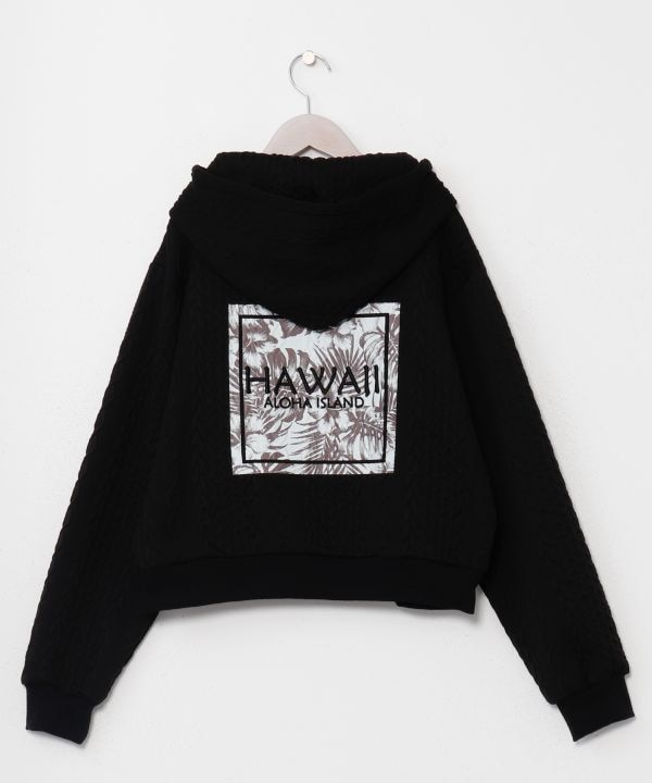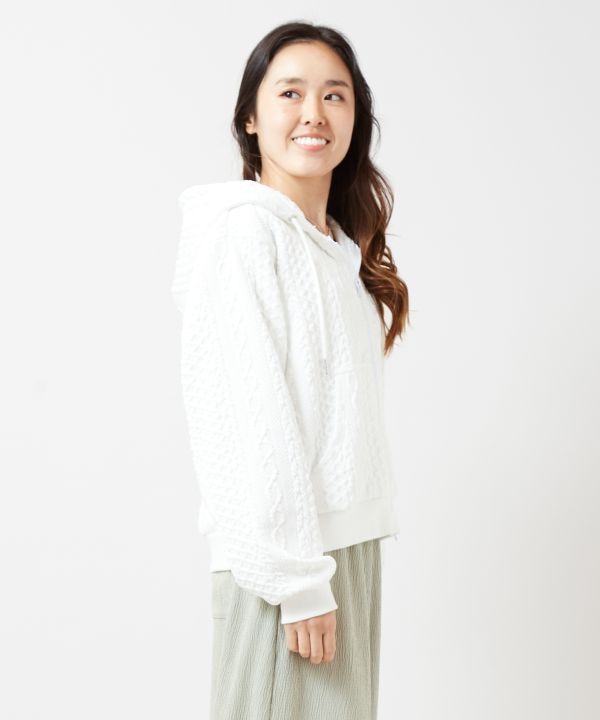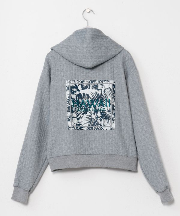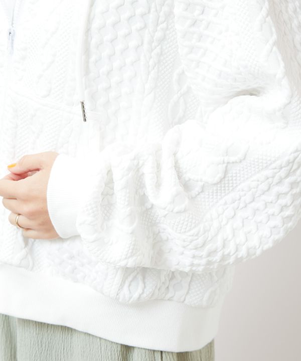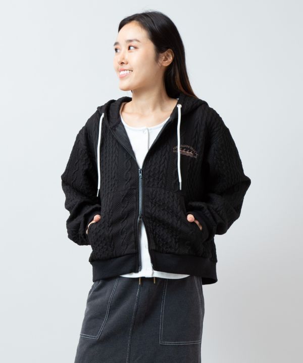 ふくれジャカード素材の短丈ジップパーカー。立体感のある生地に刺しゅうを重ねたデザインが印象的です。フロントのワンポイント刺しゅうがアクセントになり、コーディネートしやすいWジップ仕様。薄すぎない生地で肌寒い時期の羽織りにも活躍します。