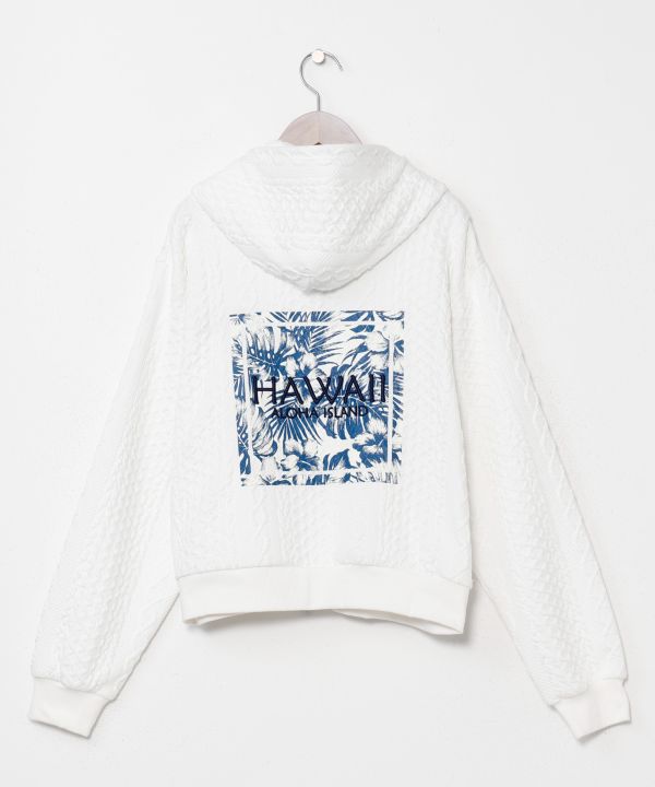 ふくれジャカード素材の短丈ジップパーカー。立体感のある生地に刺しゅうを重ねたデザインが印象的です。フロントのワンポイント刺しゅうがアクセントになり、コーディネートしやすいWジップ仕様。薄すぎない生地で肌寒い時期の羽織りにも活躍します。