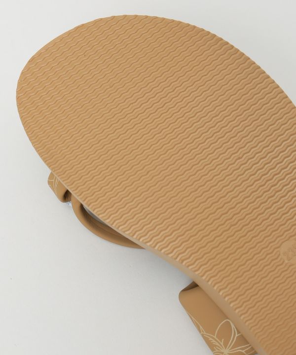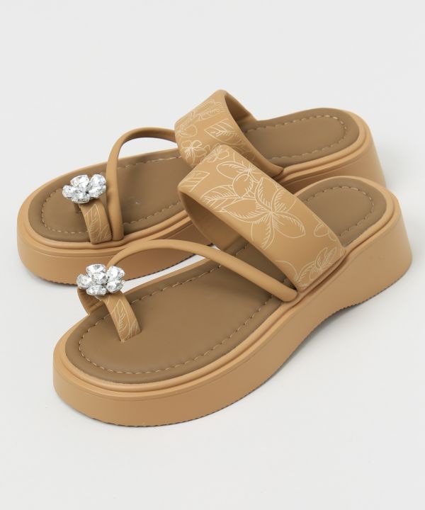 大きなプルメリアビジューが輝く厚底サンダル。トレンド感のあるボリュームソールで脚長効果も。足元にハワイの花を咲かせるような華やかさがあり、リゾートコーデを格上げします。