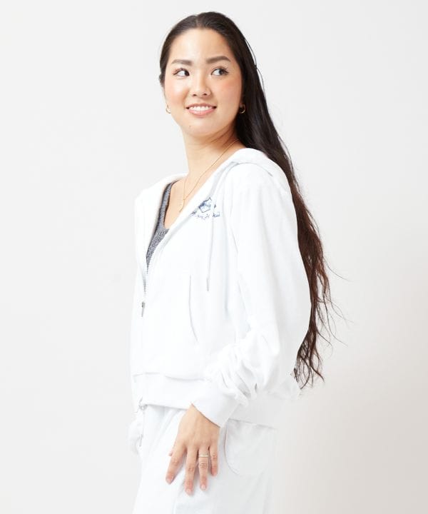 柔らかなパイル素材を使用したフードジップパーカー。通気性が良く夏でも快適に着用可能。フードに施された刺しゅうがデザインのアクセントで、Wジップ仕様により着こなしのアレンジも楽しめます。