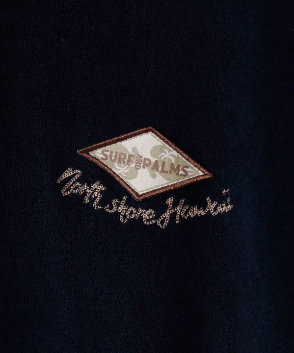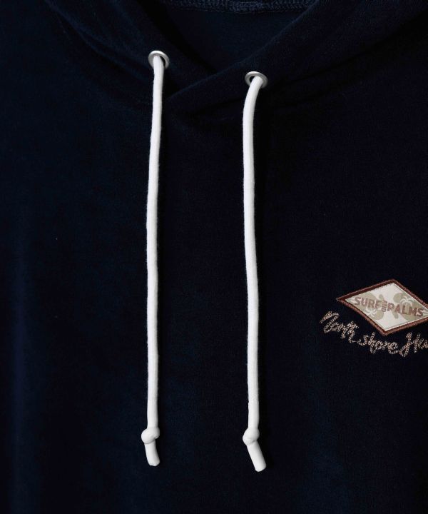 柔らかなパイル素材を使用したメンズフード付きトップス。さらっとした肌触りで夏でも快適に着用できます。フードに施された刺しゅうがさりげないアクセントに。
