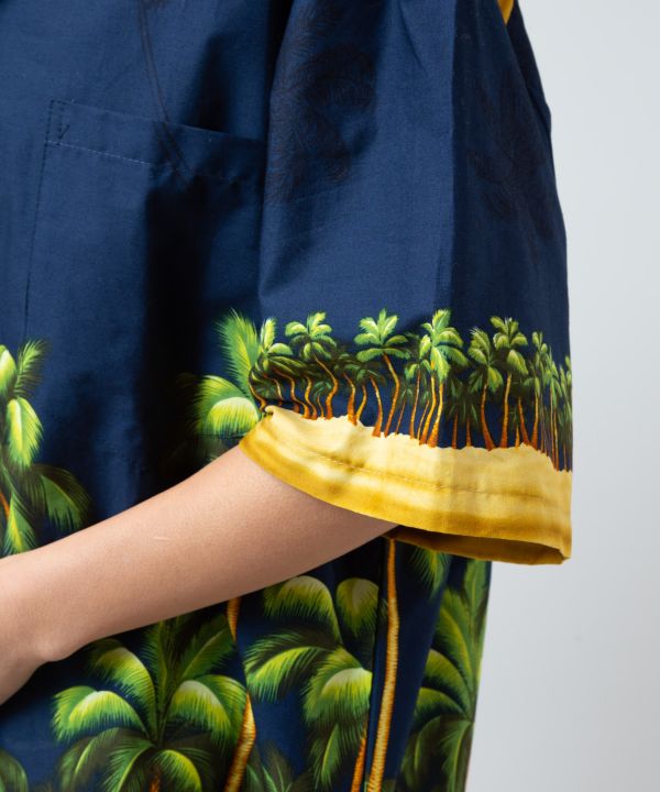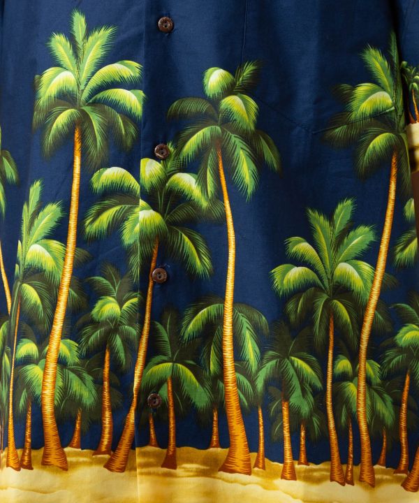 ハワイから届いたメンズアロハシャツ。ヤシの木が並ぶトロピカルなデザインが印象的で、南国の穏やかな雰囲気を感じさせる一枚です。綿100%のさらりとした肌触りで快適な着心地。ナチュラルな風合いが魅力で、デニムやリネンパンツとも好相性。リゾートや旅先でのリラックススタイルにぴったりのアロハシャツです。