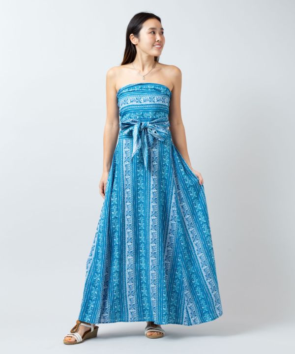 タパモチーフをプリントしたサッシュスカート。巻き方次第で30通り以上のアレンジが楽しめるデザインです。自分らしいスタイルを演出でき、お出かけやリゾート挙式にもおすすめ。