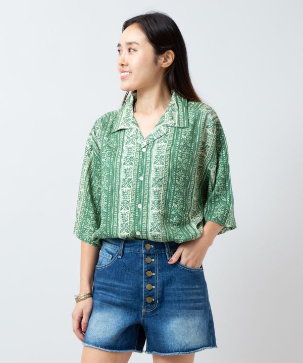 タパモチーフをプリントしたメンズアロハシャツ。伝統的なデザインをモダンに落とし込み、リゾートにも日常にも映える一枚です。