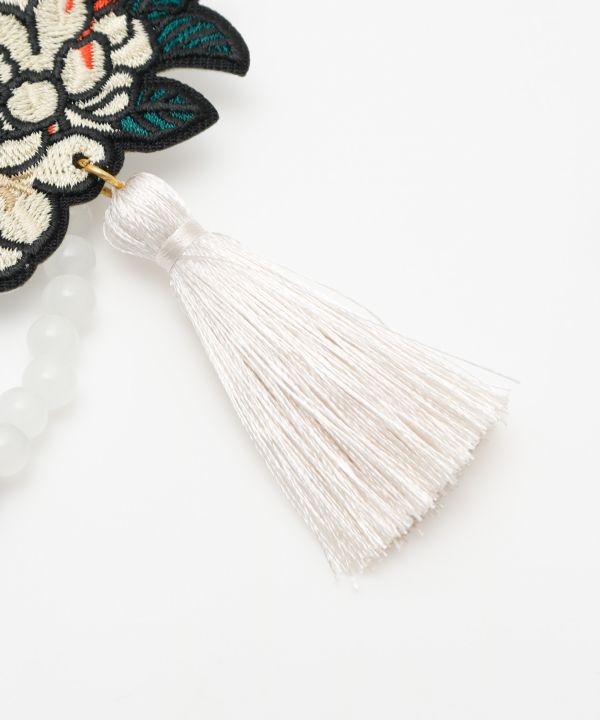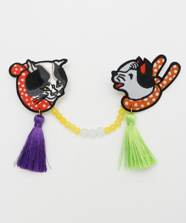 対となる和モチーフが印象的な羽織止め。犬と猫、夫婦(めおと)、花鳥の組み合わせに遊び心と縁起の良さが込められています。ビーズ部分は取り外し可能で、ブローチや髪飾りとしても使える万能デザイン。揺れるタッセルが華やかさを添え、装いを一段と格上げします。