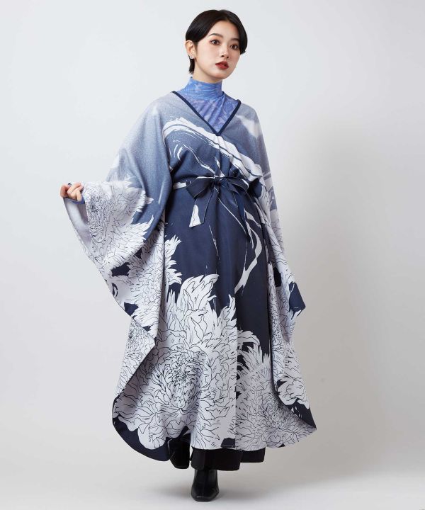 和モードな雰囲気溢れるワンピース。牡丹の花と墨流し柄を織り交ぜたデザインで、振袖をイメージしたシルエットが印象的です。贅沢に生地を使ったドレープが美しく、身頃のホールに通すウエスト紐で着方のアレンジも可能。お手入れが簡単なポリエステル素材で、帯ベルトなどを合わせてもお楽しみいただけます。