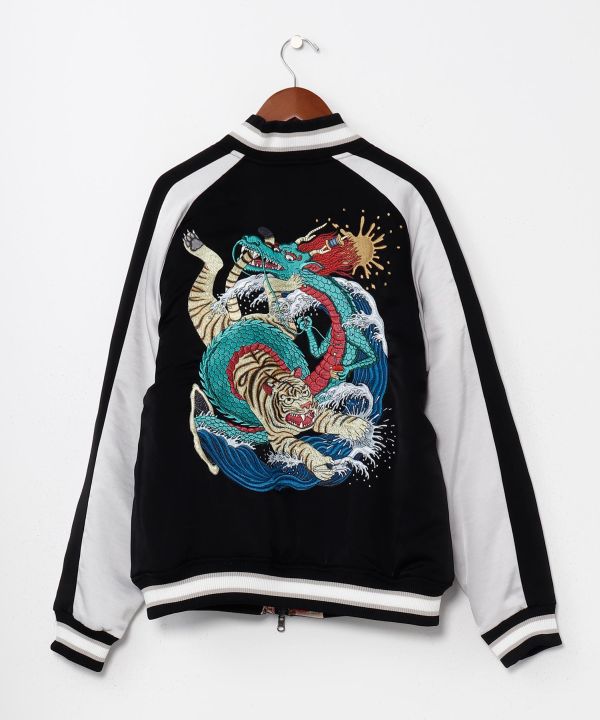 【倭物やカヤ×鈴木ひょっとこ】コラボのジャケット。伝統×現代の融合を魅力的に描く、画家・鈴木ひょっとことのコラボ商品。表面には描き下ろしの「龍虎」刺しゅう、裏面は「大漁」をモチーフにした総柄を配したリバーシブル仕様。和装の衿元をイメージしたデザインが上品な印象を添え、サテン生地のなめらかな肌触りも魅力。デニムやワンピースなど和洋問わず自在にコーデを楽しめるユニセックスの和モダンスタイルを演出する一枚です。