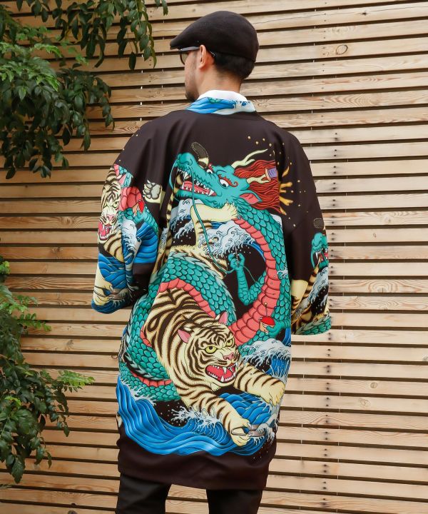 【倭物やカヤ×鈴木ひょっとこ】コラボのリバーシブル羽織り。伝統×現代の融合を魅力的に描く、画家・鈴木ひょっとことのコラボ商品。描き下ろしの「龍虎」、「風雷」「ミーアキャット」が大胆に描かれ、表裏で異なる表情を楽しめるデザインです。さらりとしたポリエステル素材で扱いやすく、和装にも洋服にも合わせやすいユニセックスデザイン。現代に映える新感覚の和スタイル羽織りです。