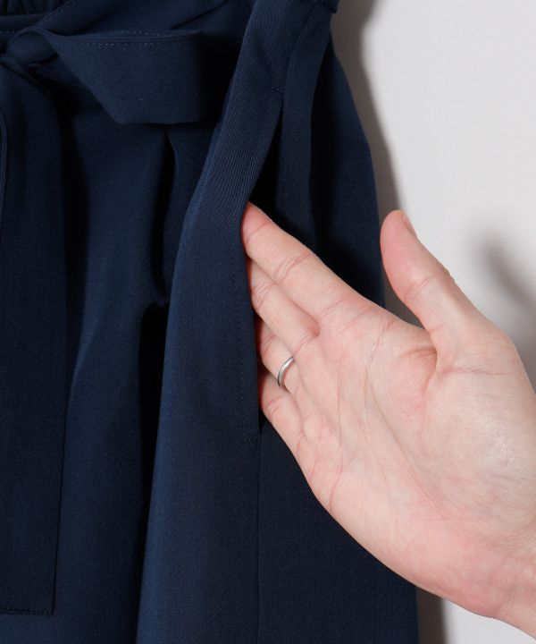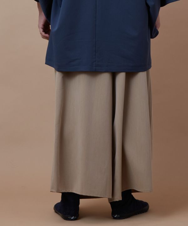無地でコーディネートに合わせやすいメンズパンツ。大きなタックを入れることで袴のようなシルエットに仕立てました。ウエスト紐付きで調整がしやすく、すっきりとした腰まわりが特徴です。さらりとした肌触りのポリエステルレーヨン生地で足さばきも軽く、サイドとバックにポケットが付いています。