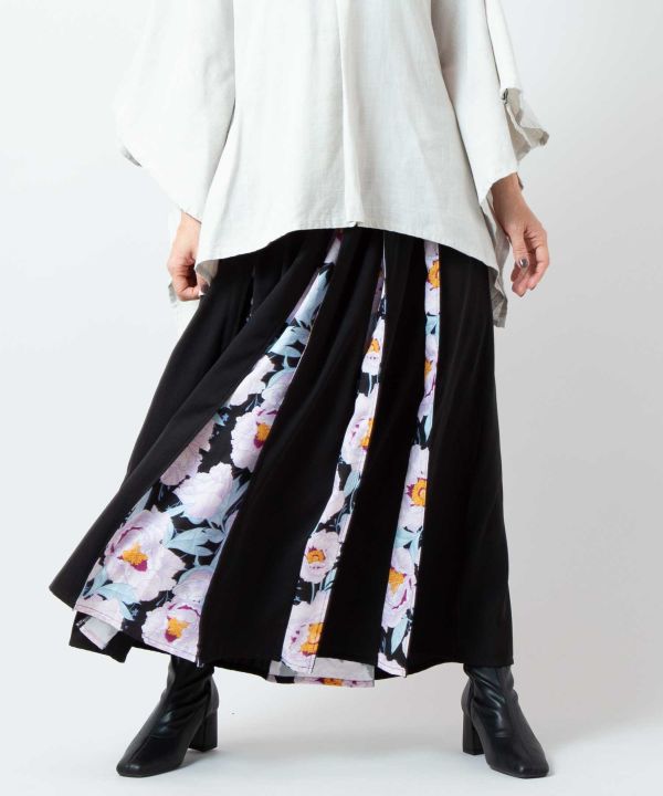 花柄をあしらった八掛(はっかけ)のスカート。袴をイメージした形で、動くたびに揺れるシルエットが美しい仕立てです。シワになりにくいポリエステル素材を使用し、一華、芍薬、牡丹の花が上品に彩ります。日常にも特別な日にも映える華やかなスカートです。
