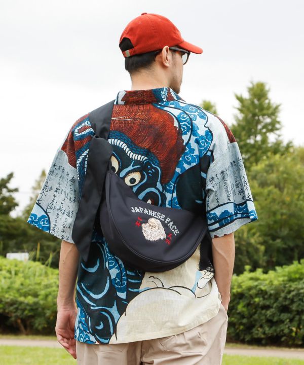 日本を代表する「顔」が刺しゅうされたたすきバッグ。浮世絵のようなユニークなデザインと撥水加工の実用性を兼ね備え、和モダンなスタイルにぴったりです。