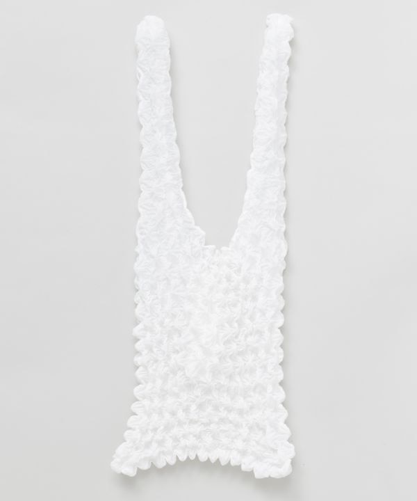 しぼり加工の立体感がユニークなバッグ。使わないときはコンパクトに収納でき、使うときはしっかり伸びて荷物をたっぷり収納可能。内側ポケット付きで、スマホや財布の整理にも便利。エコバッグとして普段使いや旅行にも活躍します。