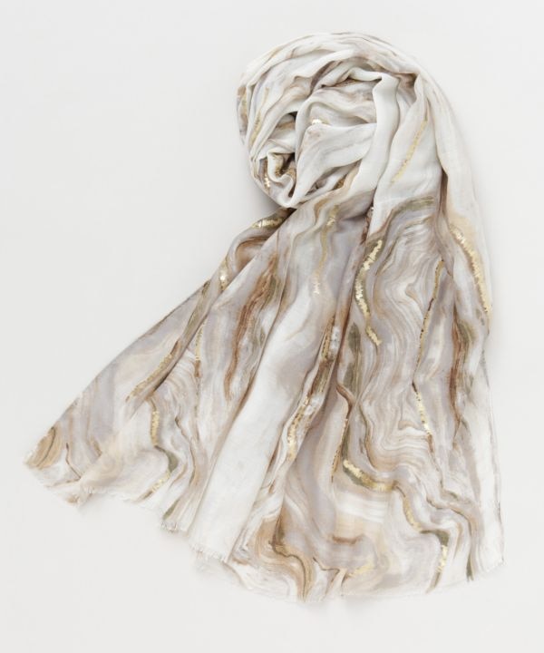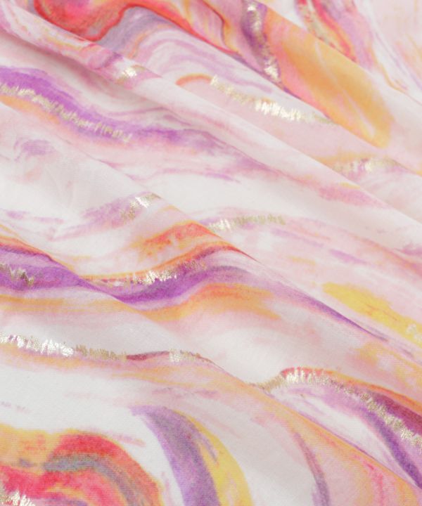 水面に映る光の揺らめきを思わせるマーブル模様が印象的な大判ストール。繊細な色の重なりとほのかな光沢が、巻くだけで上品な表情を演出します。軽やかな素材で肌なじみも良く、日よけや冷房対策にも最適。コーディネートに洗練されたアクセントを添える一枚です。