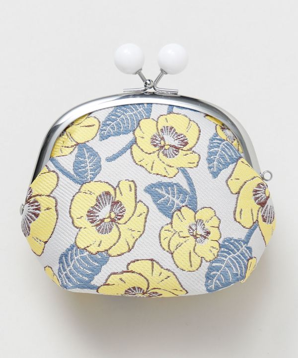 春の花々をモチーフにした、昭和モダンな雰囲気漂う玉付きがま口。ミモザやポピー、パンジーなど季節の彩りを上品に描いたデザインが魅力です。丸みのあるフォルムが愛らしく、開け閉めしやすい玉付き金具もポイント。お菓子や小物などを入れるのにちょうど良いマルチサイズなアイテムです。