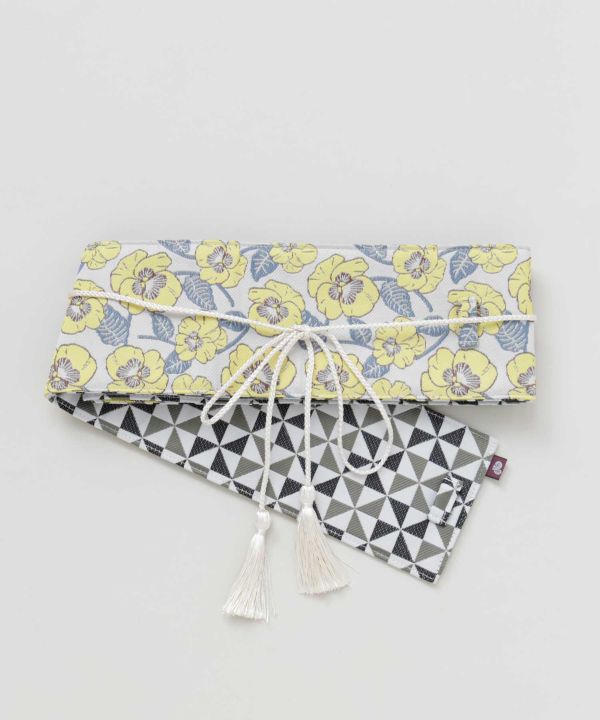 春の花々を描いた昭和モダンなデザインの帯ベルト。表は華やかな花柄、裏は上品な小紋柄で、リバーシブル仕様が魅力です。タッセル付きの紐がアクセントとなり、巻くだけで装いに和の趣をプラス。ワンピースやチュニックなど洋装にも合わせやすく、手軽に和モダンコーデが楽しめる一品です。