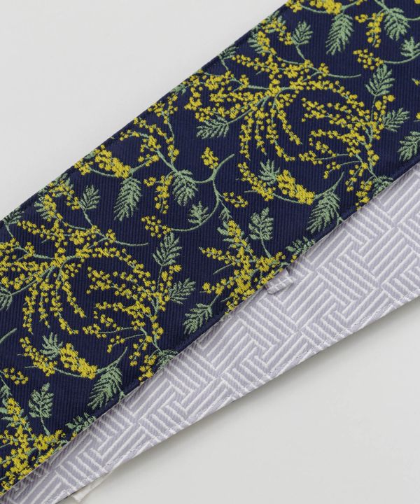 春の花々を描いた昭和モダンなデザインの帯ベルト。表は華やかな花柄、裏は上品な小紋柄で、リバーシブル仕様が魅力です。タッセル付きの紐がアクセントとなり、巻くだけで装いに和の趣をプラス。ワンピースやチュニックなど洋装にも合わせやすく、手軽に和モダンコーデが楽しめる一品です。