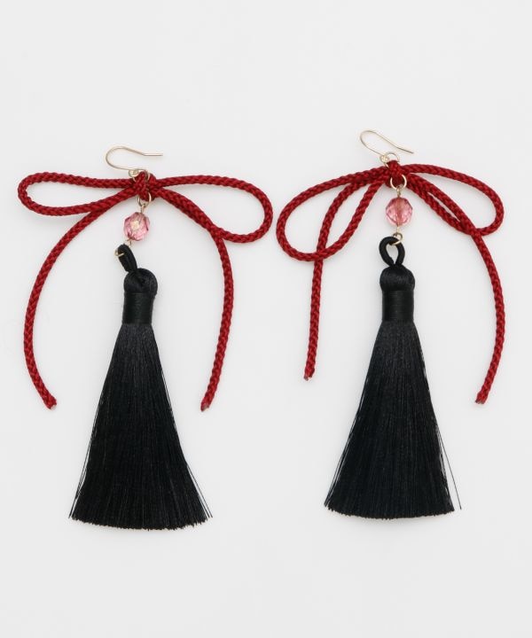 縁を結ぶ象徴とされる「結び」をモチーフにしたピアス。華やかな組み紐の蝶結びと大ぶりのタッセルで顔回りが華やかな印象に。特別な日の装いにもおすすめのアクセサリーです。