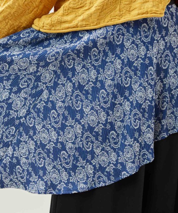 モン族衣装に着想を得たアシンメトリーデザインのパンツ。花柄ジャカードと覆い布のレイヤード風デザインで存在感抜群。