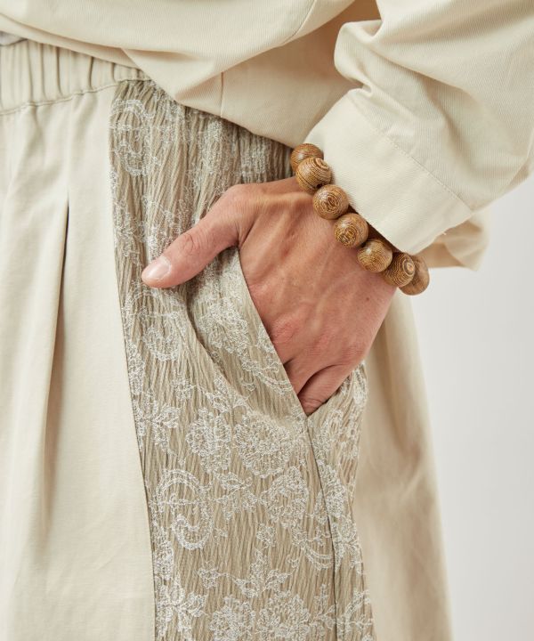 モン族から着想を得た異素材切替のパンツ。花柄ジャカード生地とワイドシルエットが個性を引き立てるデザイン。