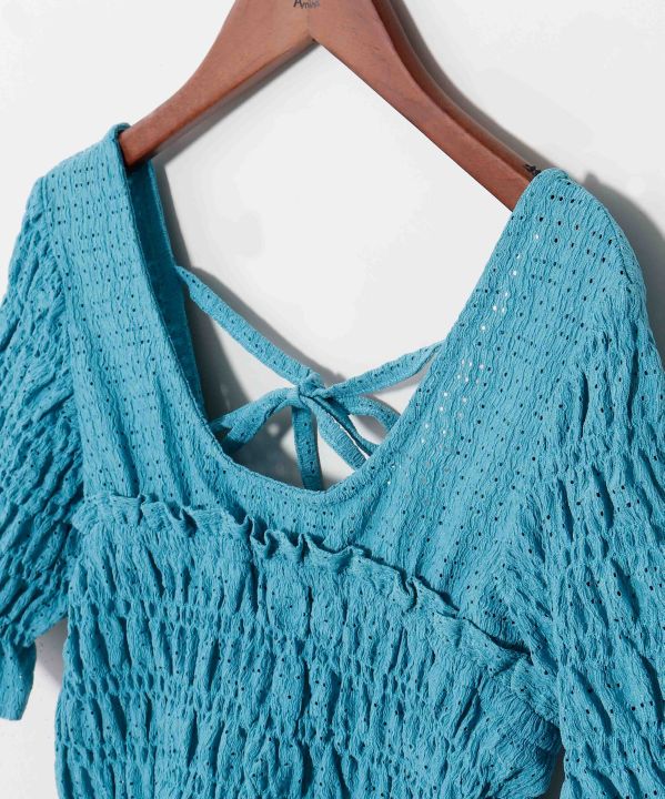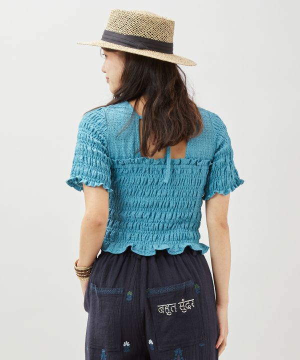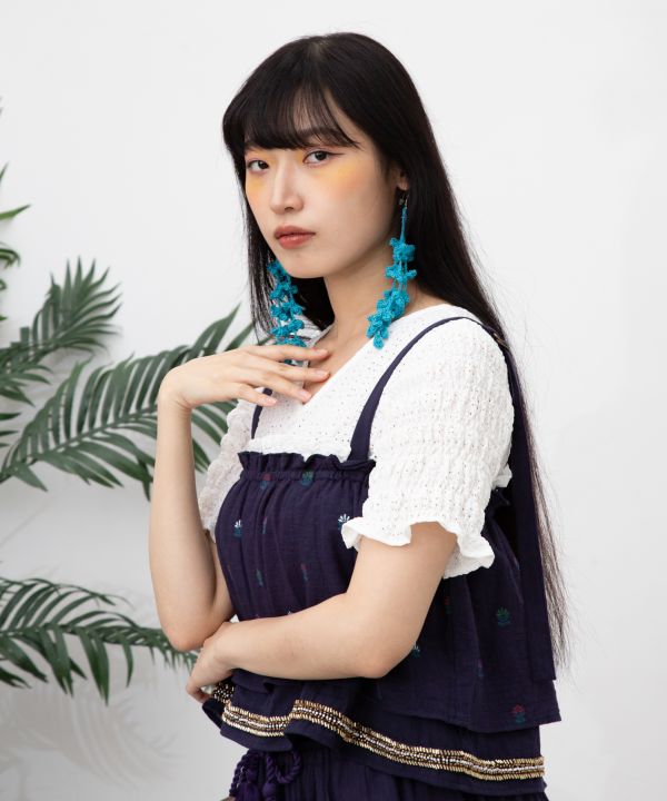 インドの民族衣装「チョリ」から着想を得たトップス。背中開きで鮮やかなカラーリングがサリーの雰囲気を演出。着心地の良い伸縮素材。