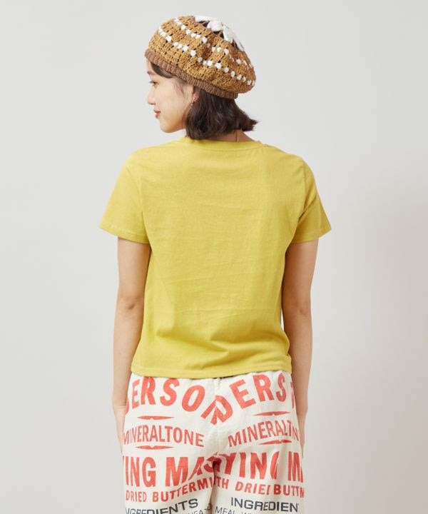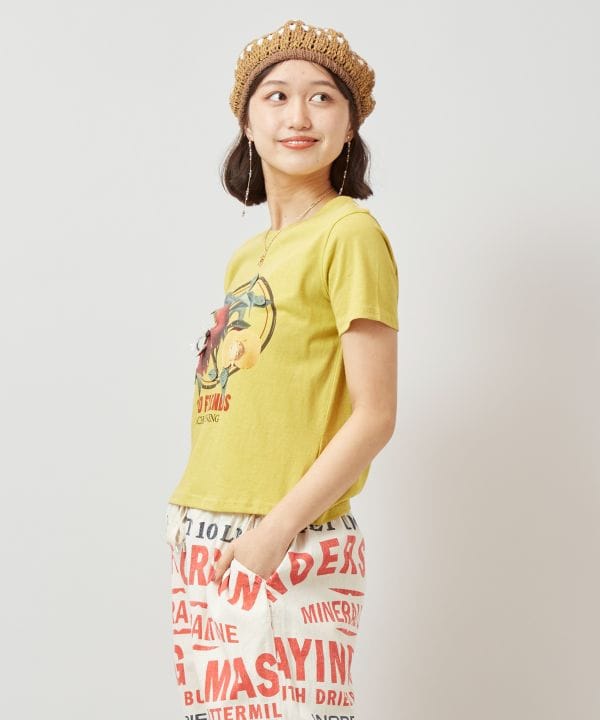 フルーツモチーフのプリントに花や葉の立体的な縫い付けが施されたこだわりのTシャツ。短丈シルエットで古着感もあり、どんなスタイルにもなじむ一枚。季節を問わず活躍する万能トップス。