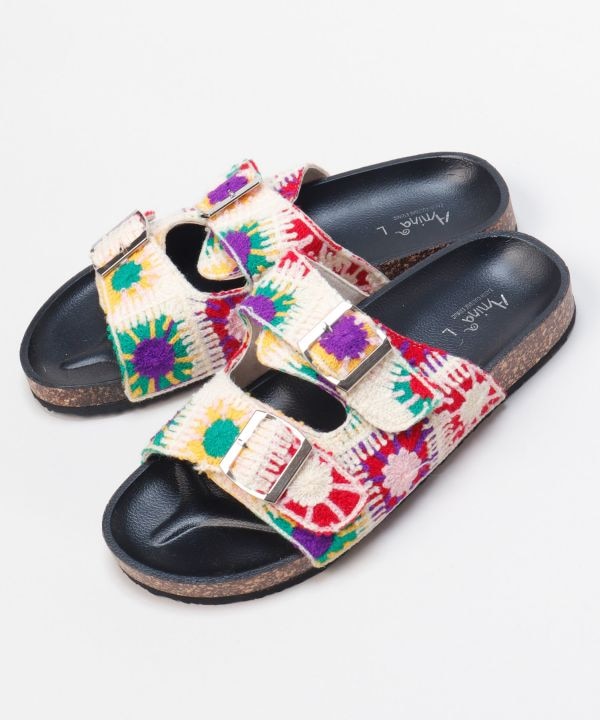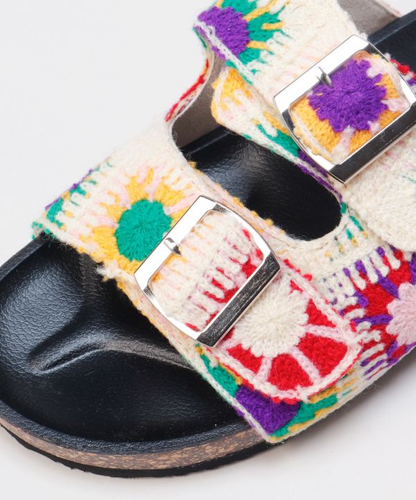 クロシェ風素材を使用したカジュアルなサンダル。素朴で優しい風合いが特徴で、ベルト調節可能で履き心地も快適。リゾートや街歩きにも活躍するナチュラルデザイン。