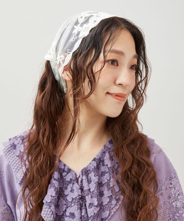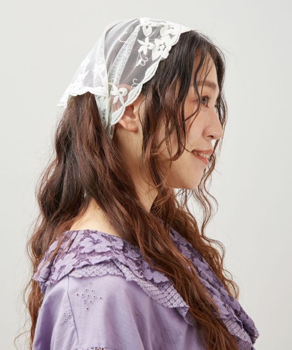 花柄刺しゅうが施された三角巾型ストール。透け感のある素材がナチュラルな雰囲気を演出。頭に巻いてヘアアレンジ感覚でも楽しめるアクセントアイテム。