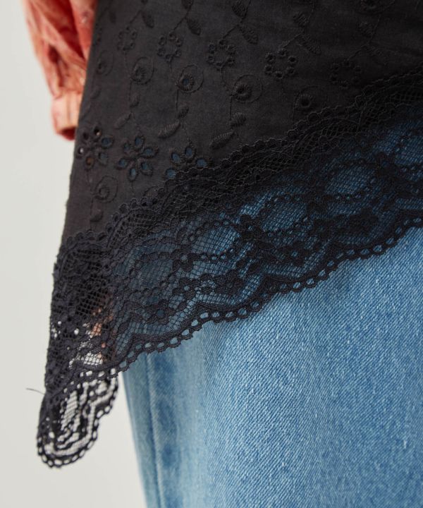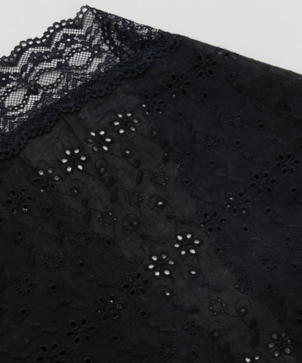 大ぶりの花柄が目を惹く三角巾型のレースストール。程よい透け感で顔まわりに軽やかさを添え、テープ部分で結ぶだけの簡単アレンジで個性をプラス。