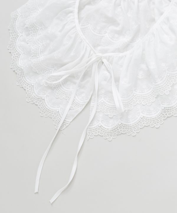 細やかな刺しゅうが映えるレースWAYスカーフ。ひも付きデザインで調整しやすく、首元や腰、付け襟スタイルなど自由なアレンジで楽しめる。