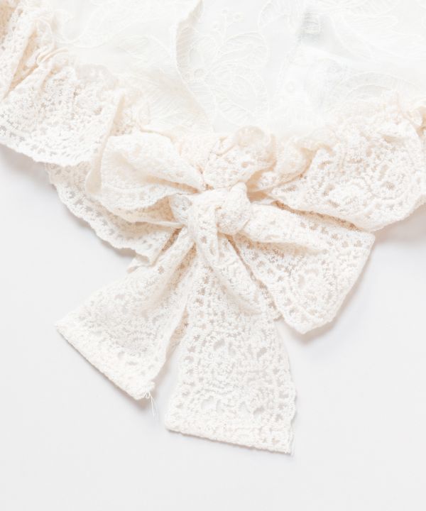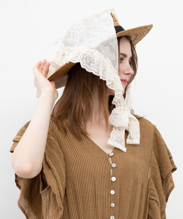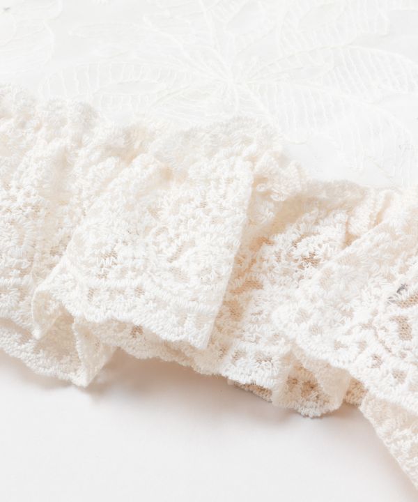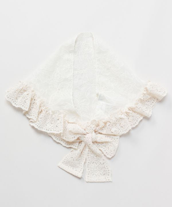 裾のフリルが華やかな三角巾型ストール。繊細な透け感のレースで、頭・首・腰などに巻くだけで装いをぐっと引き立てるアクセントになるアイテム。
