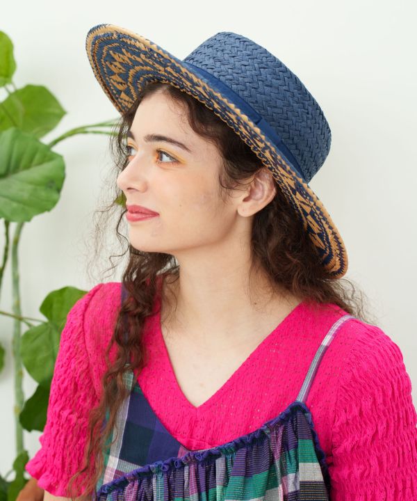 ツバ部分に幾何学柄が編み込まれたナチュラルなカンカン帽。素朴な素材感に遊び心ある柄が映え、普段使いや旅先でも活躍。サイズ調整可能。
