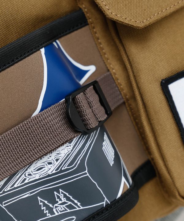 【Amina×grn×ogawa】三社コラボのバッグ。アウトドアブランドとのコラボで生まれた多機能ショルダーバッグ。外側にはボトルポケット付きで、タウンユースから野外フェスまで活躍。遊び心あるタグとギミックも魅力。