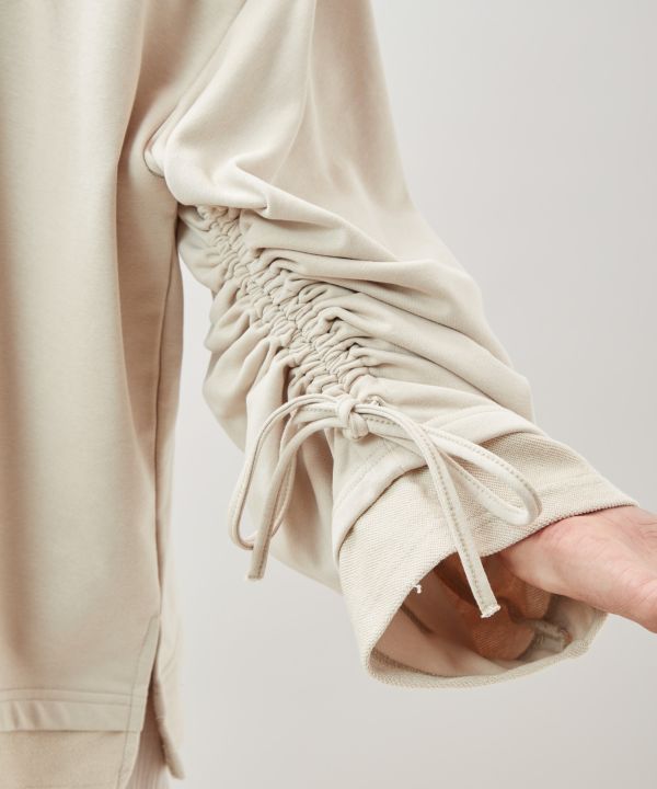東洋の美と西洋の感性が融合した「シノワズリ」の世界観を纏うトップス。牡丹(ぼたん)の花を大胆にプリントし、銀糸の刺しゅうがさりげない輝きを添える一枚。斜めのハーフジップや異素材切り替えなど、細部まで個性が光ります。