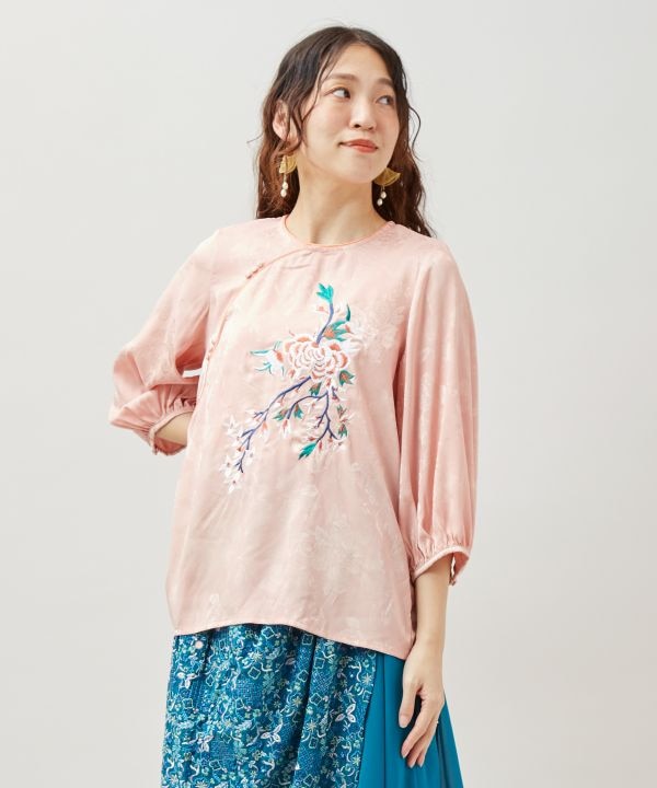 艶感のあるサテンジャカードに牡丹の刺しゅうを施した七分袖ブラウス。アオザイ風デザインと配色の背面タックがエレガントな印象。