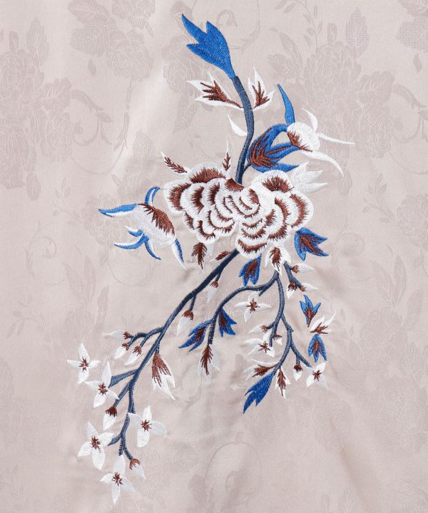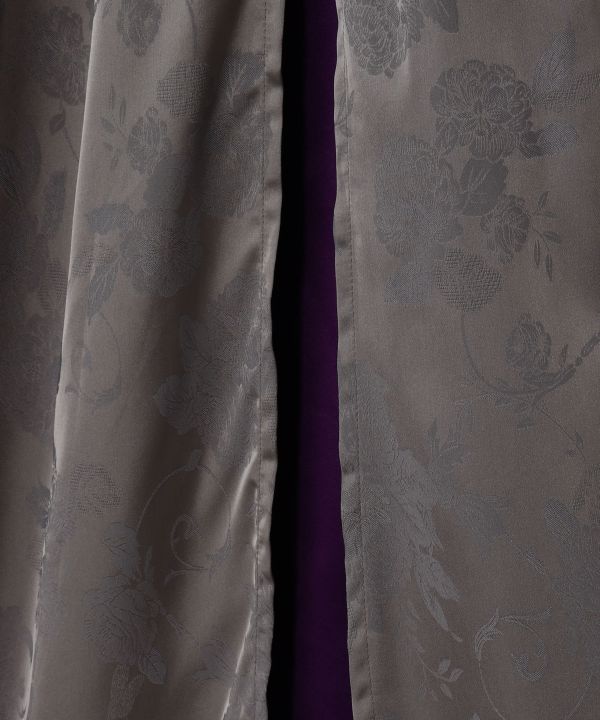 牡丹の刺しゅうとスリットから見える配色生地が美しいフレアパンツ。アオザイに着想を得たデザインで、レイヤード風の華やかな仕上がり。