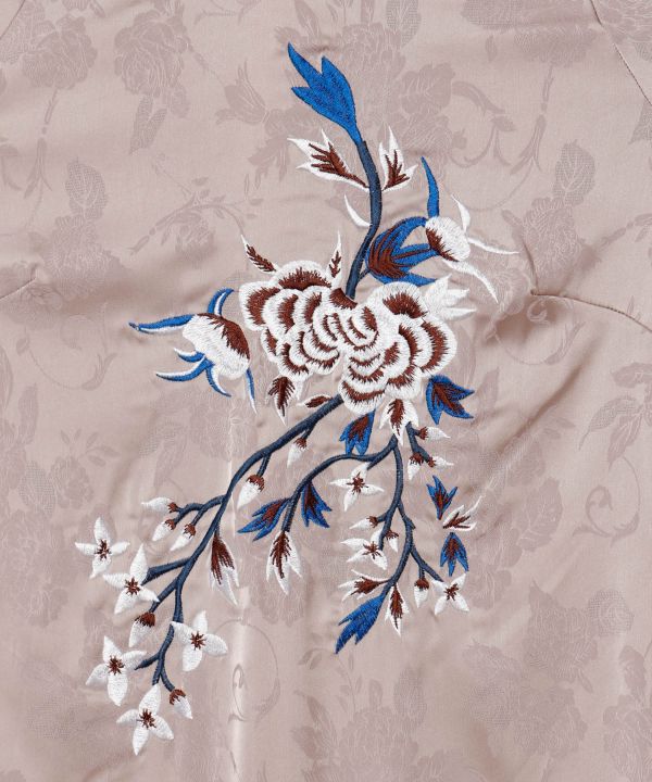 牡丹の刺しゅうと大胆なスリットが印象的なアオザイ風ワンピース。サテンジャカードの艶やかさが女性らしさを引き立てる一枚。