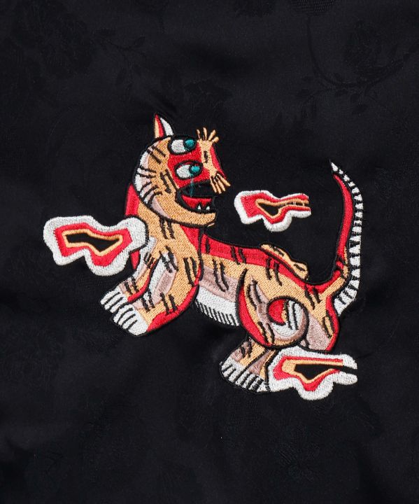 サテンジャカードと虎の刺しゅうが存在感を放つ開襟シャツ。袖のレースが妖艶さを加え、ゆったりシルエットでオリエンタルな雰囲気が漂う一枚。