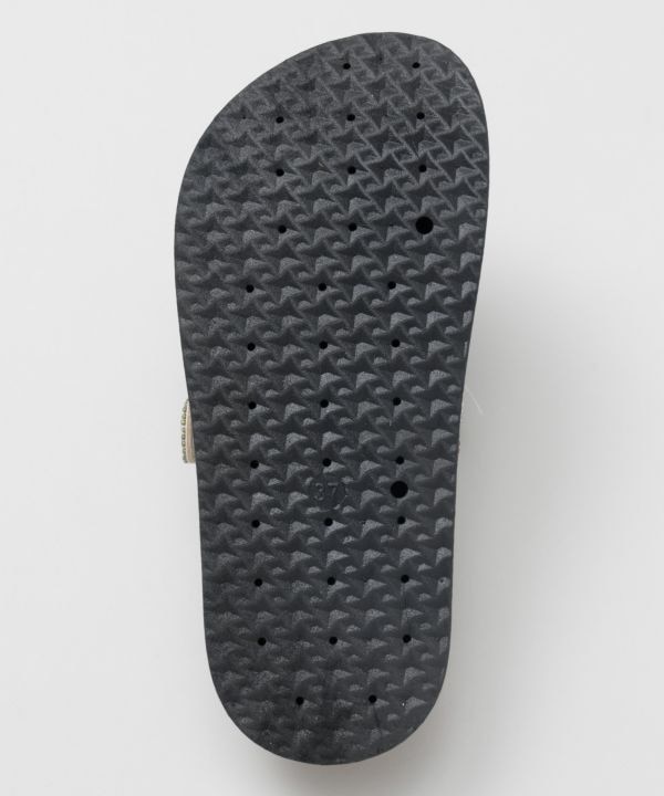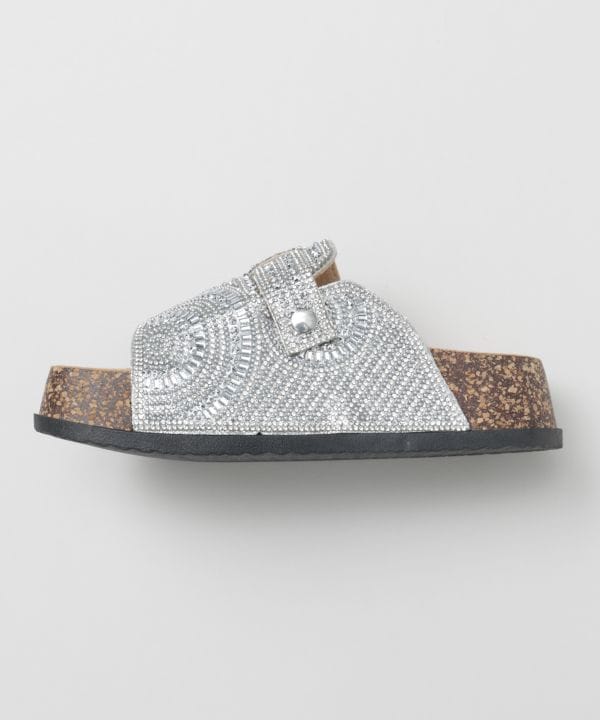 マンダラ柄のような円が描かれた厚底サンダル。キラキラ輝くラメと太めベルトがアクセントに。スタイルアップを叶えつつ、光を受けて気分も明るくなる一足。