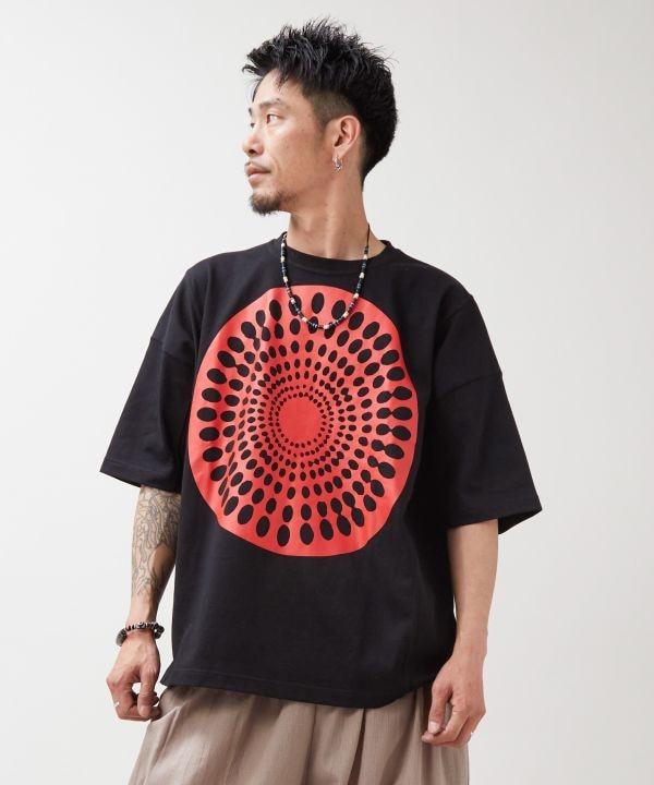 アフリカの伝統布「キテンゲ」に描かれる水紋のモチーフを大胆にプリントしたメンズTシャツ。鮮やかな単色使いと大柄構成がモダンな印象。オーバーサイズでラフに楽しめる仕様。