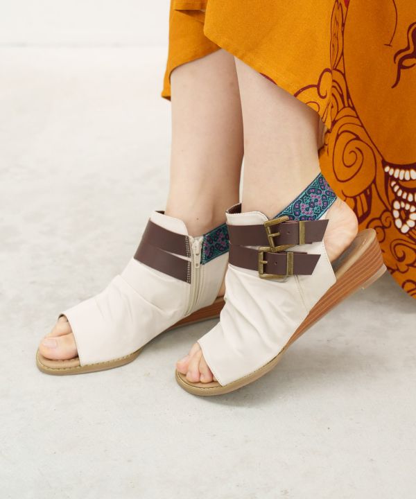 程よい高さのウエッジソールでホールド感のあるサンダル。光沢感のある生地と織りテープがアクセントになり、エスニックから綺麗めコーデまで幅広く活躍。