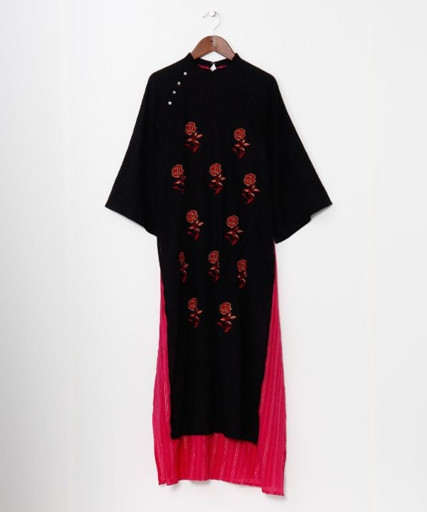 花鳥風月を思わせる薔薇刺しゅうをあしらったジャカード素材のワンピース。ベトナムの民族衣装アオザイ調シルエットとバイカラー使いが調和する、一着で映える存在感。