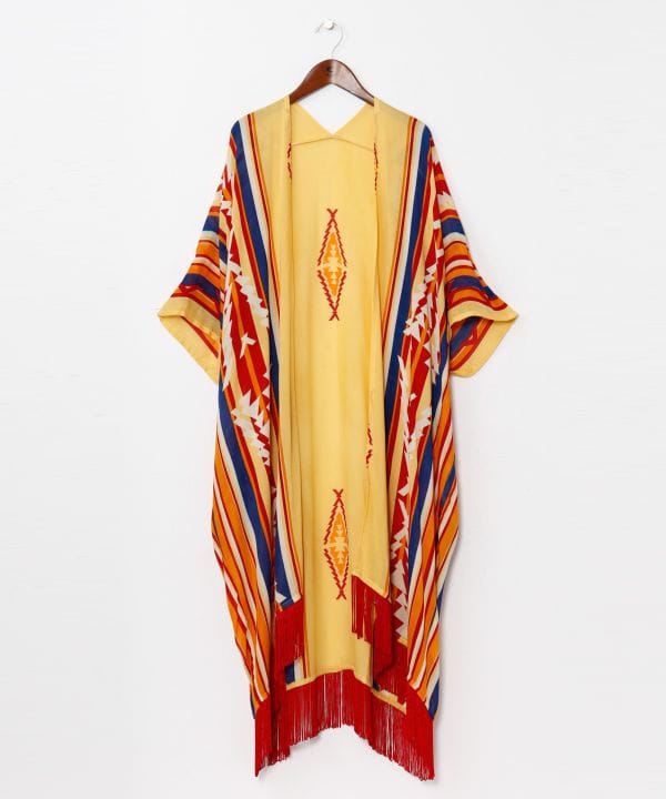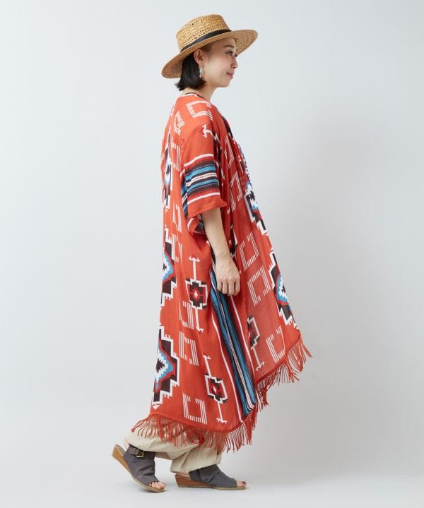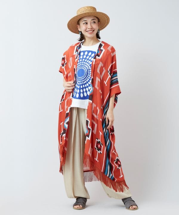 薄手レーヨン素材で涼しく着られるカーディガン。嬉しいUVカット加工付き。メキシコのチマヨ柄とサラペの色使いでメキシカンムード満点。フリンジ裾がアクセント。