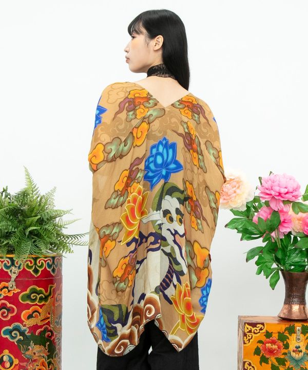 仏教美術「タンカ」を大胆にプリントしたUVカットカーディガン。ポケッタブル仕様で携帯にも便利。唯一無二の宗教モチーフが映える特別な一枚。